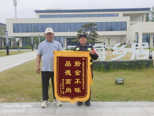 5月25日,宿遷市神盾保安服務(wù)有限公司駐朱??叼B(yǎng)旅游度假區(qū)保安員陳海玲巡邏期間,在云海鄉(xiāng)居碼頭撿拾手機一部,經(jīng)多方聯(lián)系歸還失主,后失主贈送錦旗表示感謝。